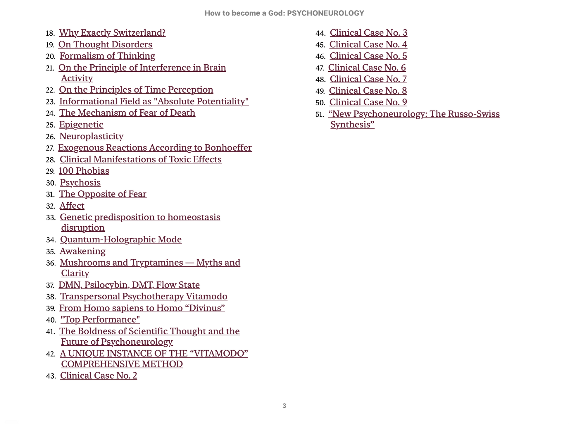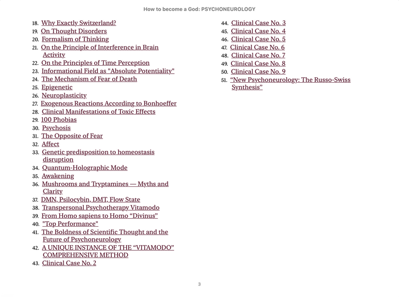 Through the "VitaModo" method, the author demonstrates how psychotherapy, the right environment, and psychedelics can reset neural patterns, breaking free from chronic disorders and fears. The book also delves into the transition from fear to joy and "divinity," offering readers new perspectives on the evolution of consciousness and personal growth.